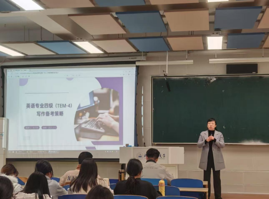 讲座由emc易倍副教授、硕士生导师郑月波老师主讲。郑老师围绕专四写作的技巧与方法进行了深入浅出的讲解,特别强调了写作部分在英语专业四级考试中的重要地位。