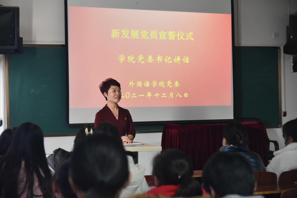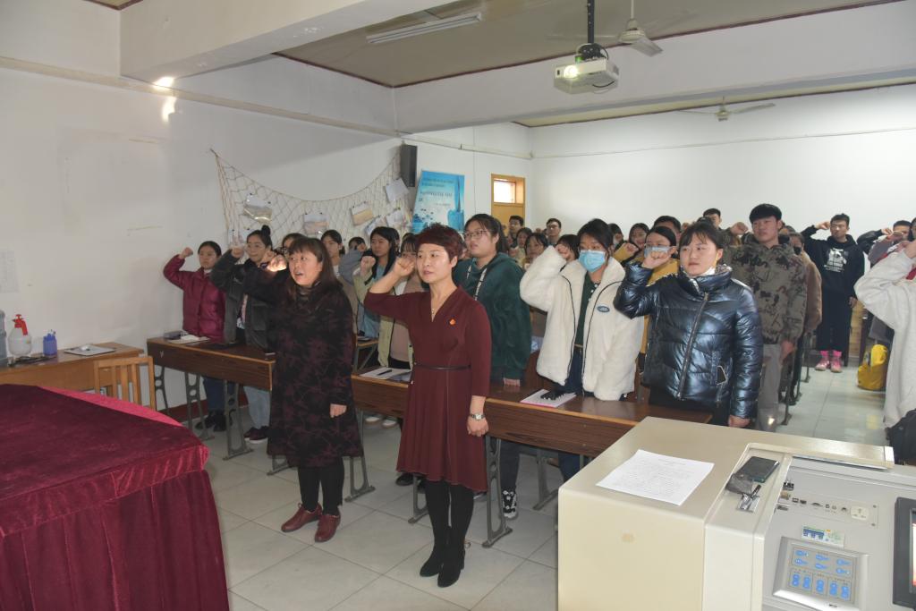 宣誓仪式上,全场师生同唱国际歌,庄严宣读入党誓词,面对党旗做出庄严承诺。