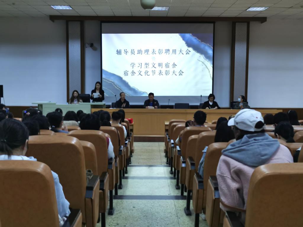 会议的开始,刘磊书记宣读了2019级、2020级优秀辅导员助理名单。紧接着,商经理为优秀辅导员助理颁发证书、刘磊书记为2020级辅导员助理颁发任聘书,2019级和2020级辅导员助理代表王雨琪和孔庆山同学依次发言,向到场的同学分享他们的经验和感受。会议进行到第二项议程,刘磊书记宣读学习型文明宿舍、文明宿舍以及寝室文化节获奖的宿舍名单,分别由刘会娟书记、商经理、刘磊书记为其颁奖。而后三位获奖宿舍代表发言,用生动有趣的PPT强调了学习氛围与干净的宿舍环境在日常生活中的重要性。最后,刘磊书记做总结发言,会议至此圆满结束。