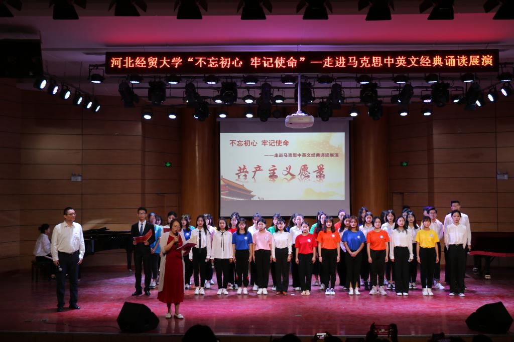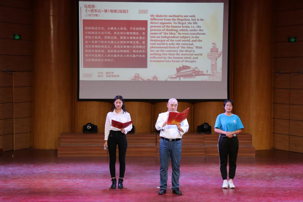 展演活动以中英文两种语言进行,公司党委书记刘会娟饱含深情地为大家介绍了马克思不平凡的一生,引起同学们对个人、学说与价值的思考。马克思主义公司教师李英、赵玉娟、王晓路等对经典选段的背景分析、思想发展逻辑的讲解、时代问题的解析;emc易倍教师安岩、张新海、邵黎明等带领员工用纯正英语进行精彩诵读,师生党员、积极分子声情并茂的表现,为大家带来一场精神盛宴。一幅幅画面,一段段文字,深深地打动了在场的每一位师生,大家仿佛走进了马克思生活的那个年代,与他的思想一同起舞,在反思与批判中感受精神的力量。当进行到“无产阶级的历史使命”一章时,刘建平副书记走上舞台,带领广大师生共同合唱国际歌,激情的歌声尽显无产阶级的战斗豪情和实现共产主义理想的坚强决心。在高昂的歌声中本次活动画上了圆满的记号。