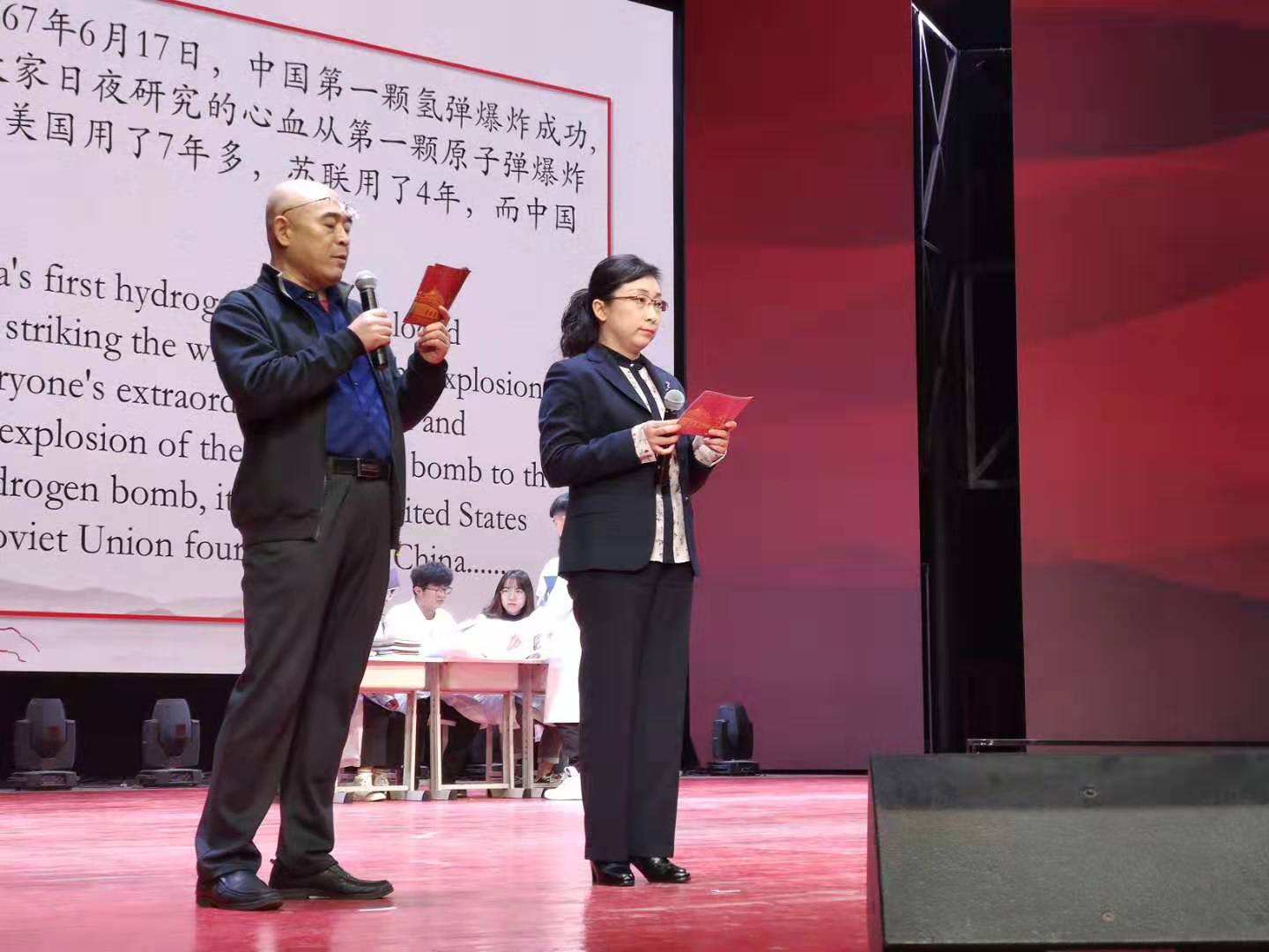 公开课一改以往主题活动的风格,参与讲解师生或以情景对话或以真情告白的形式,在优美动听的旋律中将“共和国勋章”获得者无私忘我、为国为民的伟岸形象生动地展现在全体师生面前。讲解中穿插主讲教师精心剪辑的人物视频,实现与讲解内容完美衔接,最大程度达到心灵共鸣。一个个榜样鲜活的呈现出来:干惊天动地事,做隐姓埋名人的于敏;年过古稀未伏枥,犹向苍穹寄深情的孙家栋;心中无我,付此一生的张富清;扎根大地,追梦稻田的袁隆平。多语种的变换犹如跨越国界,短视频的播放如同穿越时空。