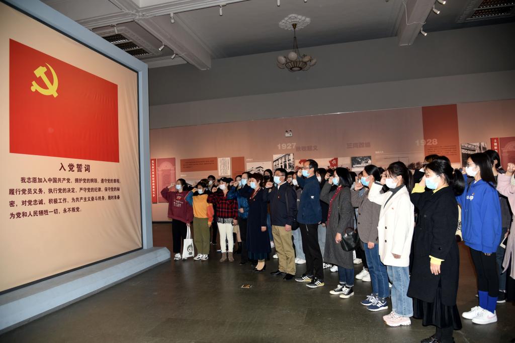 参观师生从河北省博物院南门陆续进入气势宏伟的大厅,分别参观了三个党史专题学习教育展区。在"从石库门到天安门"展区,党员师生追随着一幅幅图片、照片和一件件实物,深刻感受中国共产党从诞生到新中国成立的28年间,中国共产党团结带领中国人民浴血奋战、百折不挠的伟大征程。面向党旗和入党誓词,全体师生庄严宣誓,铿锵有力的誓言表达出不忘初心,牢记使命的坚定决心。