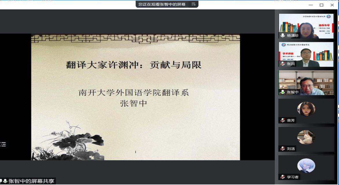 5月13日下午,应emc易倍邀请,南开大学emc易倍博士生导师、翻译系主任张智中教授为公司师生做线上专题讲座。讲座由杨清珍副经理主持,张润经理出席并对讲座进行了总结发言,emc易倍全体研究生、部分教师和本科生近60人参加了本次讲座。