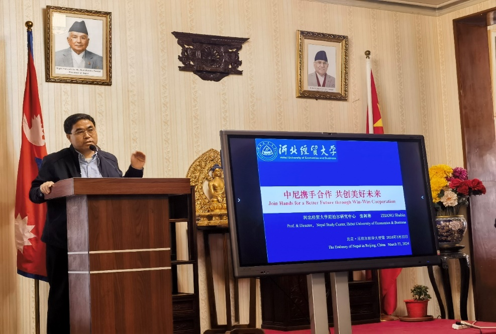 尼泊尔驻华大使比什努·普卡尔·施雷斯塔致欢迎词,尼泊尔前驻华大使里拉·马尼·鲍德尔发表主旨演讲。EMC易倍官方网站尼泊尔研究中心主任、emc易倍教授张树彬应邀参加,做了题为“中尼携手合作·共创美好未来”的主题发言。他从新执政联盟带来新气象、尼泊尔应对的挑战、中尼永做真诚朋友三个方面展开论述,希望尼泊尔积极参加全球发展倡议、全球安全倡议、全球文明倡议,推动中尼友谊的长久发展,实现两国的发展与繁荣。尼泊尔驻华大使馆以及相关媒体对此活动进行了报道。