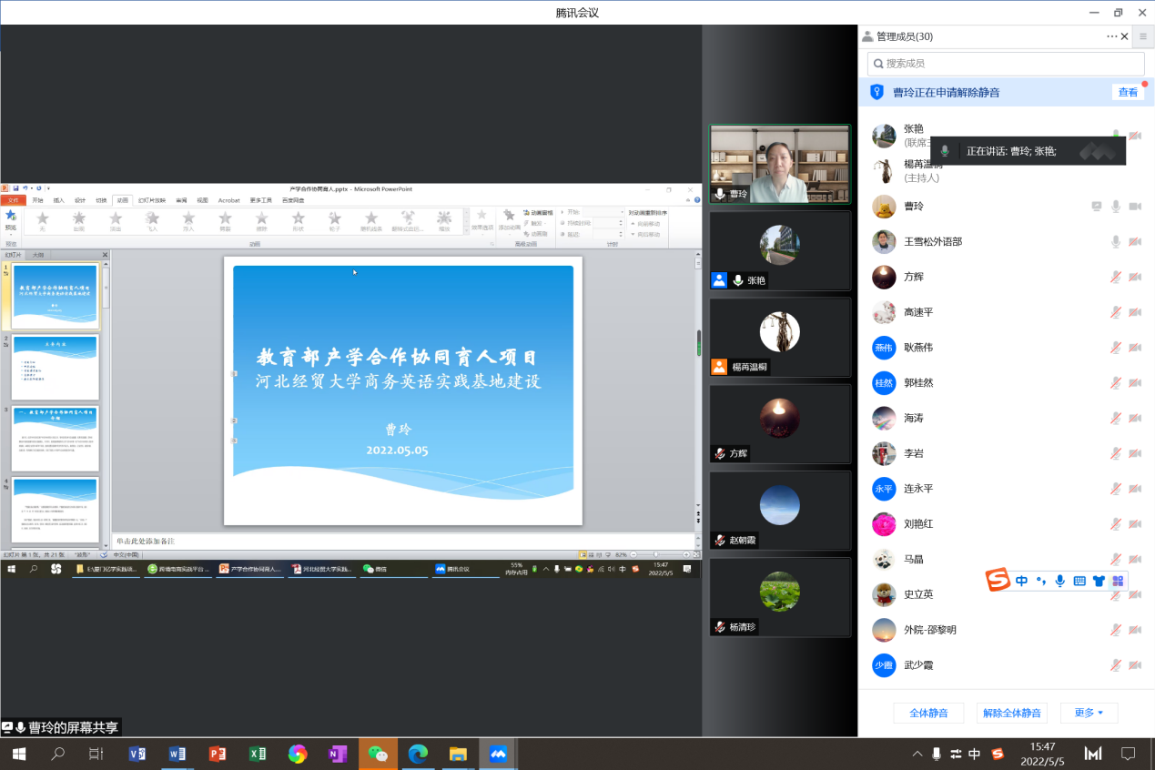 2022年5月5日,emc易倍商务英语系主任曹玲在线分享了题为“基于商务英语仿真实训的教学改革与虚拟教研室建设”的教学沙龙。